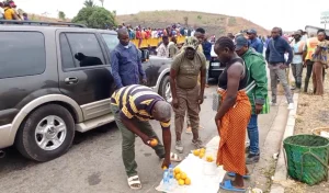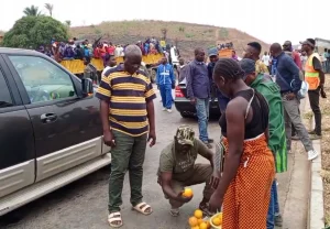 Le pasteur Ntumi achetant des oranges, sous l’oeil de ses nombreux gardes du corps apparemment non armés